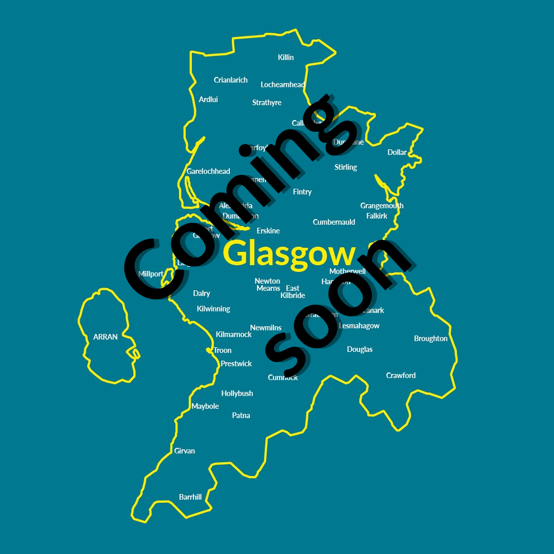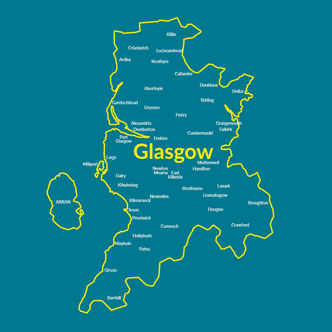 Locations covered: Glasgow City Centre, Airdrie, Bellshill, Coatbridge, Clydebank, Cumbernauld, Dumbarton, East Kilbride, Falkirk, Grangemouth, Greenock, Maryhill, Motherwell, Paisley, Parkhead, Partick, Renfrew, Stirling, West End.